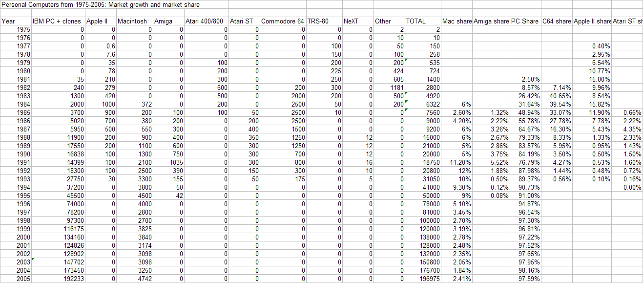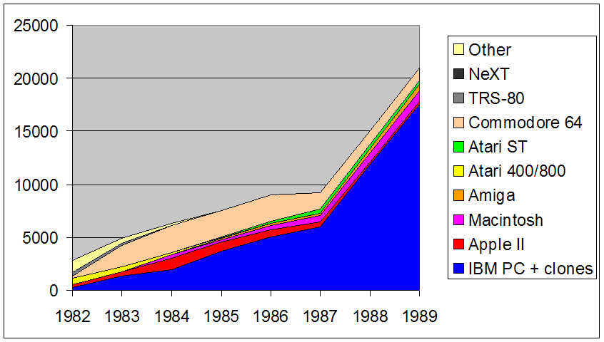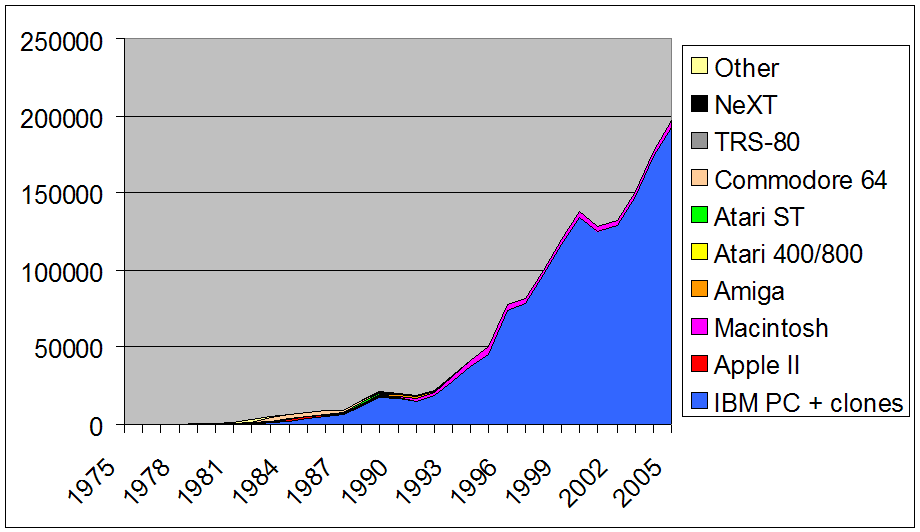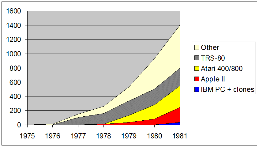 The Altair sold a few thousand units in 1975. Today, more than 130 million personal computers are sold each year! How did we get here, and which computer platforms were around for the journey? A lot of people who have come into personal computing recently do not know that there were once many different platforms-- a glance at a 1980 issue of Popular Computing revealed over 100 different manufacturers of incompatible brands!